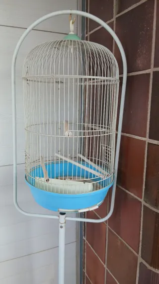 Jaula para pájaros con un diseño clásico y un soporte para colocarla. Le hace falta una mano de pintura a la base - Base de plástico resistente. - Estructura de alambre. - Incluye perchas.