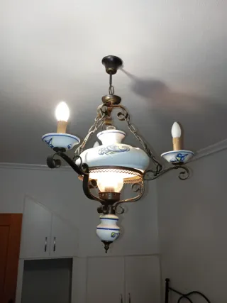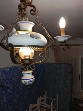 Lámpara estilo antiguo de cerámica y metal simulando bronce muy bien conservada. Tiene tres bombillas hacia arriba simulando ser velas, y una bombilla en el centro bajo la campana de cerámica que simula ser un quinqué. Es una preciosidad para una casa de campo o una cabaña. Desde el techo hasta la punta más baja mide 78, pero se puede alargar mediante la cadena. En las fotos está regulada a la mínima altura.