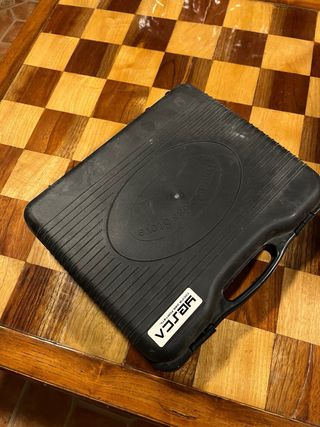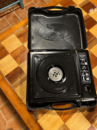 Estufa de gas portátil para camping, ideal para exteriores. - Diseño compacto y fácil de transportar. - Incluye maletín para guardarla.