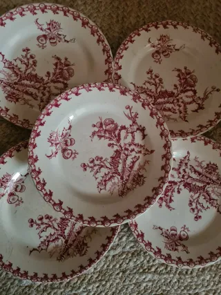 Plato llano con un diseño de cardos en color rojo sobre fondo blanco. Terre de fer, finales del siglo XIX. El borde está decorado con un patrón repetitivo. - Diseño: Chardons. - Color: Rojo y blanco. - Borde decorado. Precio por unidad 5 unidades disponibles