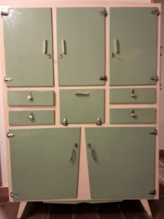Alacena de cocina antigua - Combinación de colores beige y verde. - Fabricada madera con apliques de metal. - Buen estado de conservación, aunque le vendría bien algo de restauración. - Conserva las llaves originales de apertura de estantes y cajones. - Se puede recoger en Avila o en San Lorende El Escorial.