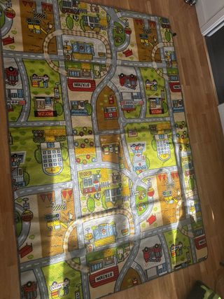 Alfombra infantil con un diseño de ciudad y carreteras, ideal para juegos. - Diseño de ciudad con calles, edificios y vehículos. - Colores vivos y alegres. - Material de tela resistente.