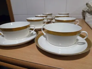 Elegante juego de consomé de la marca Bidasoa. - 8 Piezas de porcelana fina con sus platos. - Detalle de borde en oro en el cuenco y en el plato. - Diseño clásico y refinado. Apenas se ha usado.