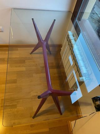 Elegante mesa con sobre de cristal y una base de diseño llamativo. - Base con forma de estrella en color morado. - Patas con detalles metálicos dorados en los extremos. - Diseño moderno y escultural.