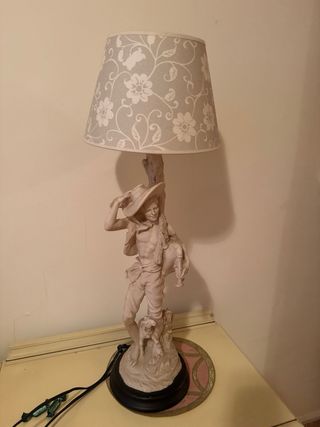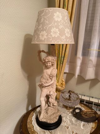 Elegante lámpara de mesa con una base decorada con una figura de querubín. Su diseño clásico la hace ideal para cualquier rincón. - Pantalla con estampado floral. - Base detallada con figura. - Combina materiales de calidad.