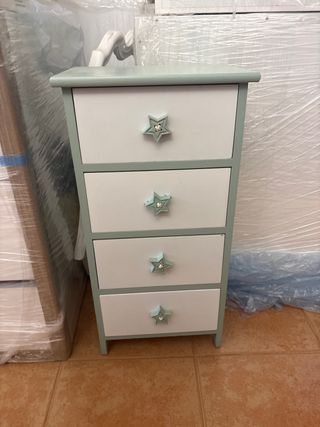 Mueble de almacenaje con cuatro cajones, ideal para habitaciones infantiles. Presenta un diseño encantador con tiradores en forma de estrella. - Estructura principal en color blanco. - Detalles y marco en color verde menta. - Tiradores decorativos en forma de estrella.