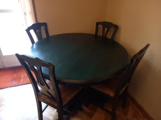 Conjunto de mesa redonda y cuatro sillas de madera de pino maciza Medidas cerrada: 117 cm x 80 cm alto. Medidas abierta: 157 cm x 117 cm x 80 cm alto. También dispongo a juego de 2 mesas una para centro del sofá rectangular y otra para la esquina cuadrada. El prees de la mesa redonda y las 4 sillas. Para el conjunto completo se estudiaría otro precio.