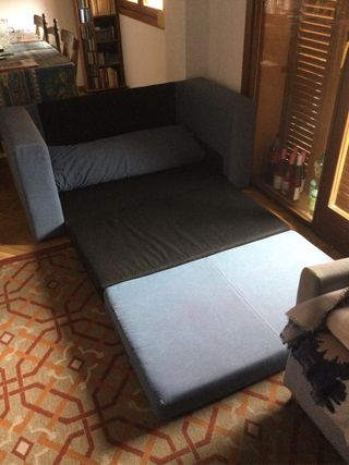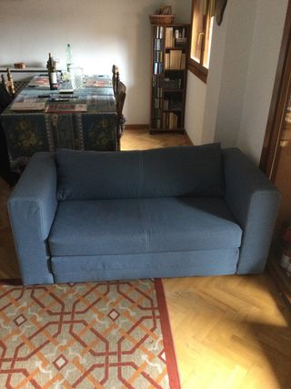 Sofá cama de tela con un diseño moderno y funcional. - Tapicería en tonos azul y beige. - Estructura de madera. - Ideal para optimizar espacios. medidas sofa :60 cm alto . espaldar , largo :145 cm .largo posabrazo : 68 cm .sofa cama desplegado : 196 cm de lecho. altura asiento sofa : 37 cm - IMPORTANTE : a recoger a domicilio , San Lorenzo del Escorial