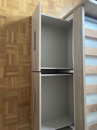 Armario de diseño moderno con puertas correderas. - Paneles frontales en blanco. - Marcos y detalles en plata. - Interior con barra para colgar y estantes. - Cajones inferiores para almacenamiento. Se vende por mudanza