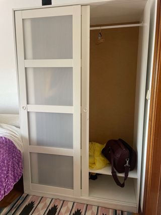 Armario de dos puertas correderas con un diseño moderno y funcional. Tiene marcas de uso, hace su funcion. - Acabado en blanco. - Paneles de las puertas con acabado translúcido.