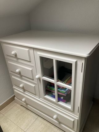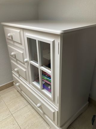 Cómoda de madera maciza con un diseño elegante y funcional. Cuenta con 4 cajones de gran capacidad y un compartimento acristalado. - Acabado en color blanco. - Puerta con cristal. - Tiradores redondos. - Medidas: 97cm alto x 97cm largo x 52cm ancho - Tiene alguna marca de uso. - Mueble de alta calidad, hecho a medida en carpintería. - Entrega en persona, no se envía.