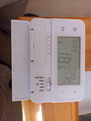 Cronotermostato digital EMOS P56060T. - Pantalla LCD. - Botones de control. - Selector de modo (AUTO, MAN, OFF, PROG, TIME/DATE). - Indicador de temperatura. - Temperatura real ajustable. - Conexión por cables. - Adjunto manual original y manual en español impreso por mi, pues en el original no viene el español, hay que descargarlo de la web.