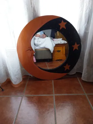 Original espejo con forma de media luna y estrellas, perfecto para añadir un toque único a tu decoración. - Marco de madera con diseño de luna y estrellas. - Acabado en tonos marrones y negros.