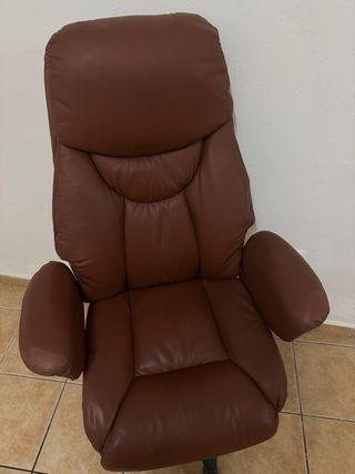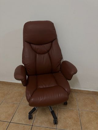 Silla de oficina con un diseño ergonómico y acolchado. Esta nueva, solo tiene un pequeño desperfecto en la perte de atras. - Tapicería de piel. - Color marrón. - Base con ruedas para fácil movilidad.