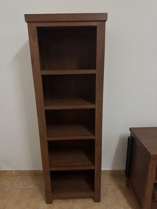 Estantería de madera con varios estantes. - Diseño vertical y estrecho. - Ideal para espacios reducidos. - Acabado en tono oscuro.