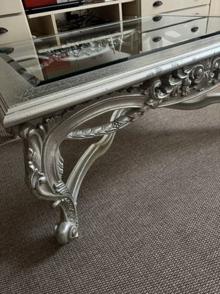Elegante mesa de centro con un diseño clásico y detalles ornamentales. - Estructura de madera con acabado plateado. - Encimera de cristal. - Patas con diseño curvo y ornamentado.