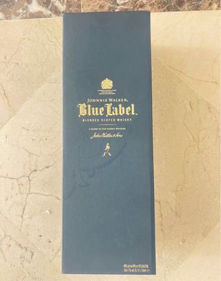 Caja vacía de la botella Johnnie Walker Blue Label. - Diseño elegante en tonos azules y dorados. - Ideal para coleccionistas o como elemento decorativo.