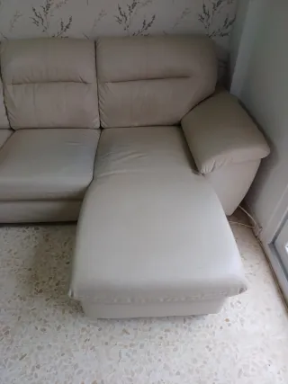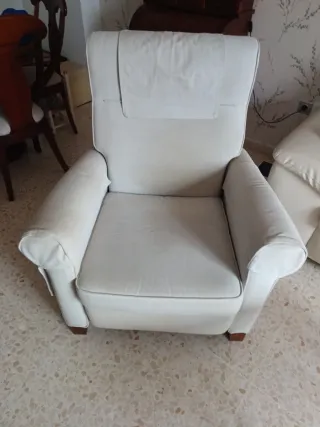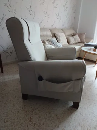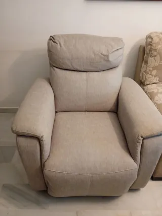 Cómodo sillón reclinable en un suave tono beige. Prácticamente nuevo - Tapicería de tela. - Diseño moderno y confortable.