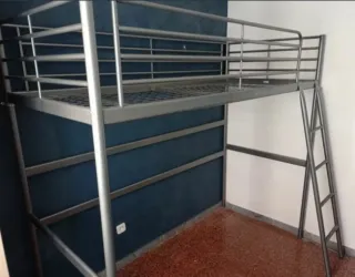 Cama alta con estructura de metal. - Diseño moderno y funcional. - Escalera integrada para fácil acceso. - Barandillas de seguridad. Tamaño de cama 90x200, apta también para colchones 90x190. Altura total 1,86 m Altura desde el somier hasta el suelo 1,45m Ancho 0,97 m Largo 2,08 m Facil montaje y desmontaje, se entrega desmontada con todos los tornillos de fábrica. Genial para cuartos pequeños y poner debajo un sofá o escritorio Se entrega en Sanlúcar de Barrameda