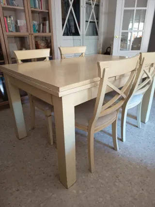 Conjunto de mesa de comedor fabricada en madera de pino, acompañada de cuatro sillas a juego. - Mesa de madera de pino, robusta - Extensible. - Incluye 4 sillas, que regalo. Están un poquito más usadas, pero aún tiene vida por delante.