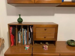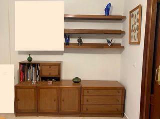 Conjunto de muebles de salón en madera. - Mueble bajo con puertas y cajones. - Estanterías de pared. - Acabado en tonos marrones. Están en muy buen estado.