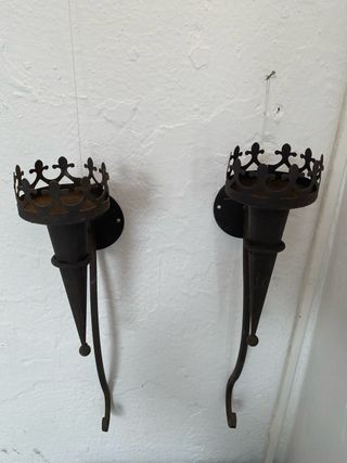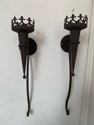 Elegante juego de dos candelabros de pared con un diseño inspirado en coronas. - Fabricados en metal. - Color negro. - Diseño de estilo medieval.
