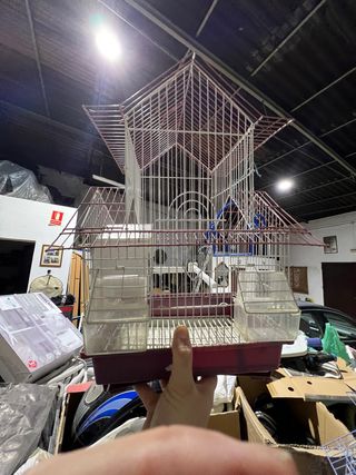 Jaula de tamaño reducido, ideal para pájaros pequeños como canarios o periquitos. Su diseño permite una fácil limpieza y acceso. - Estructura de metal y plástico. - Bandeja extraíble para residuos.