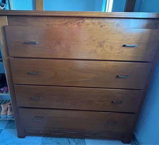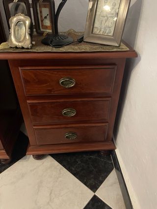 Conjunto de muebles de dormitorio en madera oscura. Incluye cómoda y 2 mesita de noche y el espejo es de madera maciza. 70€ - Cómoda con varios cajones. - Mesita de noche a juego.