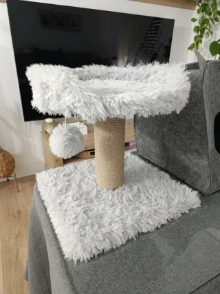 Conjunto de accesorios para gatos en tonos grises y blancos. - Diseño moderno y atractivo. - Materiales de calidad para el confort de tu mascota. - Incluye varios elementos para jugar y descansar.
