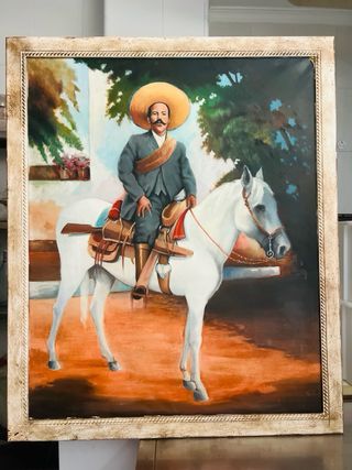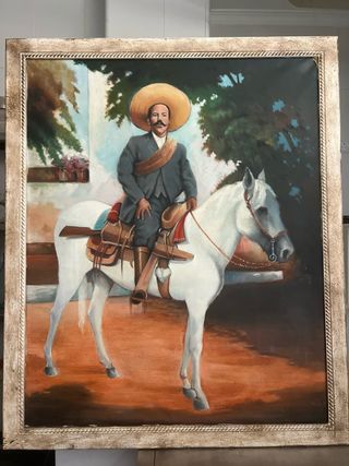 Esta es una pintura al óleo de Pancho Villa a caballo. La obra representa una figura histórica icónica. - Pintura al óleo. - Marco incluido.