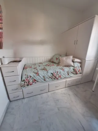 Se vende dormitorio completo en color blanco. Incluye cama con cajones, armario y mesita. - Cama con múltiples cajones de almacenaje. - Armario de dos puertas. - Mesita de noche con cajones.