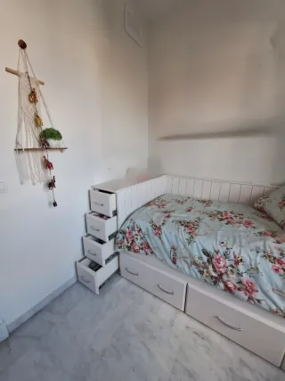 Cama de IKEA con un diseño práctico y funcional. - Estructura de cama con 4 cajones de almacenamiento y mesita de noche integrada en ella - Acabado en color blanco.