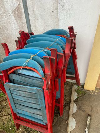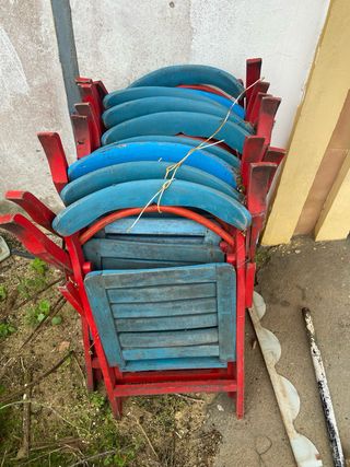 Conjunto de sillas plegables con estructura de madera y asientos en color azul. - Estructura de madera. - Asientos en color azul. - Patas y soportes en color rojo.