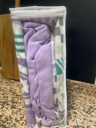 Juego de sábanas térmicas con un diseño moderno y acogedor. - Tamaño: 135 cm. - Patrón con detalles geométricos en morado y verde azulado. - Tejido suave y cálido.