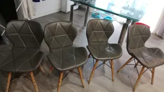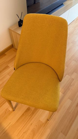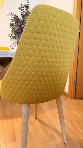 Quieres marcar personalidad y estilo? Este conjunto de sillas tiene un diseño moderno y cómodo. Están como nuevas, sin manchas ni desperfectos, alguna esta sin estrenar. - Fuertes y robustas (pesan), no como las de plástico. - Tapicería de tela. - Patas de madera. Costaban 155€/u Ahora las vendo por 90€/unidad
