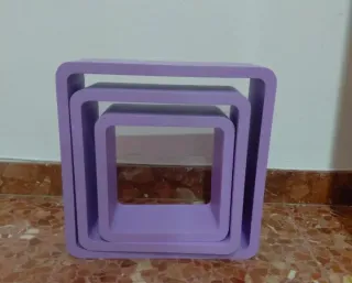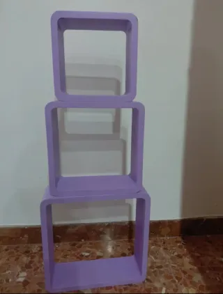 Set de tres estanterías cúbicas apilables. Son perfectas para organizar y decorar cualquier espacio. - Diseño moderno y versátil. - Acabado liso y uniforme. La grande mide 30x30 La mediana 24x24 La pequeña 20x20 Hay dos que tienen unos golpes y alguna grieta x dentro
