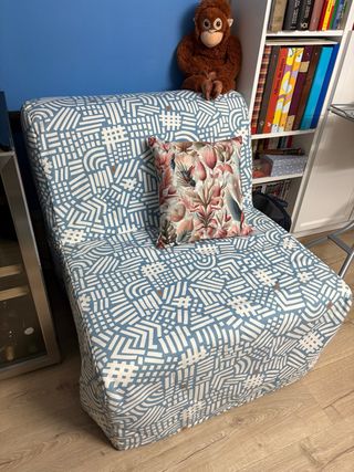 Sofá cama de IKEA, perfecto para espacios pequeños o como asiento adicional. Nunca ha sido utilizado, ni como cama ni sofa solo para dejar ropa. - Diseño moderno con funda estampada. - Estructura hierro resistente y cómoda.