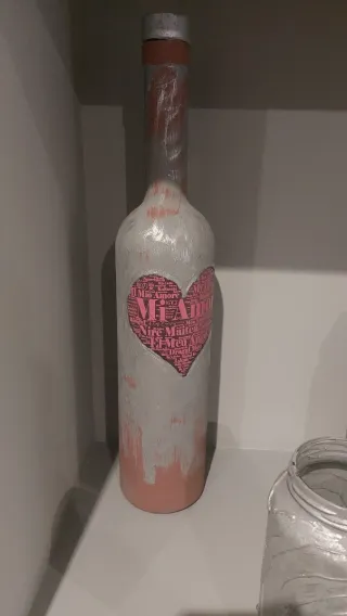 Conjunto de tres piezas decorativas para el hogar. - Botella de cristal con diseño de corazón rosa y detalles plateados. - Tarro de cristal con espiral plateada. - Tarro de cristal con cuerda de yute y diseño de red.