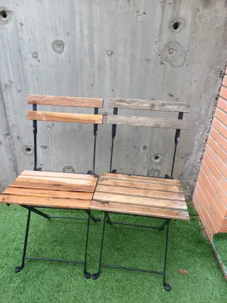 Conjunto de dos sillas plegables de Ikea, perfectas para exterior. - Estructura de metal negro. - Asiento y respaldo de listones de madera.