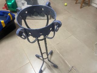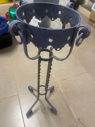 Macetero decorativo con un diseño intrincado. - Fabricado en metal. - Color azul y gris.