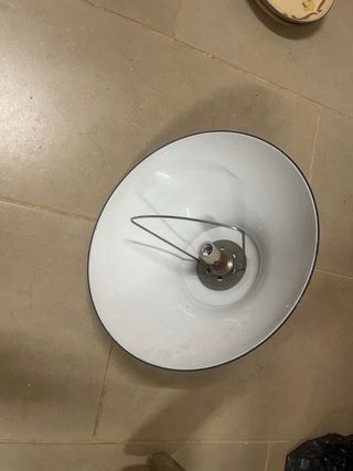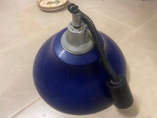 Lámpara colgante de estilo vintage con un diseño llamativo. - Acabado exterior en color azul. - Detalles metálicos en la parte superior. - Cable en espiral negro.