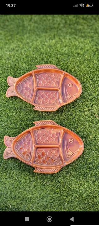Conjunto de dos bandejas decorativas con forma de pez. - Diseño detallado con escamas. - Ideal para servir aperitivos o como pieza decorativa