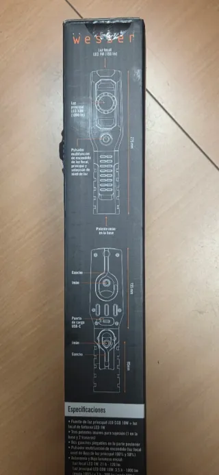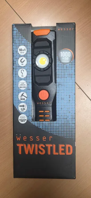 Linterna recargable Wesser Twistled con un diseño moderno y funcional. - 10+1 LEDs para una iluminación potente. - 1000 lúmenes (+150 lúmenes adicionales). - Batería de litio. - Resistencia a impactos IK08. - Autonomía de 3.5 horas. - Puerto de carga USB-C.