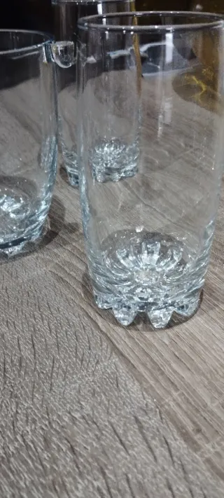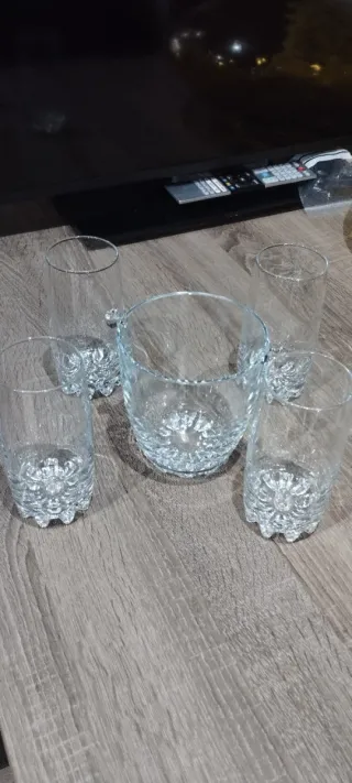 Conjunto de vasos y cubitera de cristal. - Diseño elegante y moderno. - Piezas con base texturizada _ Cuatro vasos y cubitera - El vaso mide 14 cm de alto _Nuevos , no se han usado _ La base es gruesa