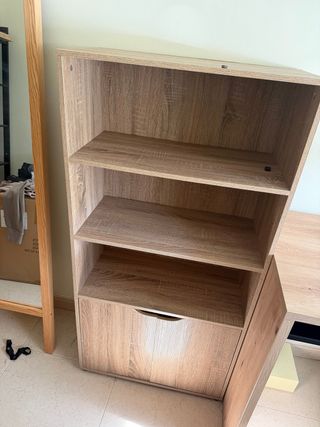 Mueble de oficina con un diseño moderno y funcional. - Acabado en madera y detalles en beige. - Estructura de madera resistente.