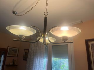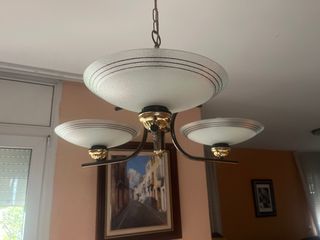 Elegante lámpara colgante de comedor con un diseño moderno. - Acabado en dorado y blanco. - Materiales de cristal y metal.