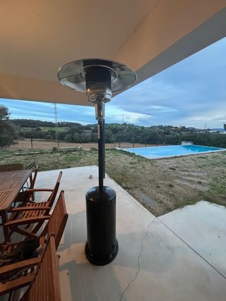 Estufa de gas para exteriores, utilizada una sola vez. - Diseño elegante en negro y plateado. - Fabricada con materiales duraderos.
