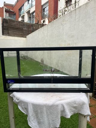 Acuario de cristal con marco negro, ideal para mantener ranas o reptiles. - Puerta frontal con cerradura y llave. - Rejilla de ventilación superior. - Bandeja inferior extraíble.