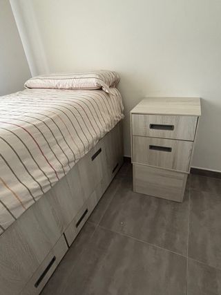 Cama nido con un diseño moderno y funcional. Ideal para optimizar el espacio en cualquier habitación. - Estructura robusta de madera. - Acabado en tonos beige y marrón. - Cajones integrados para almacenamiento. -Incluye mesita de noche y los dos colchones