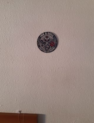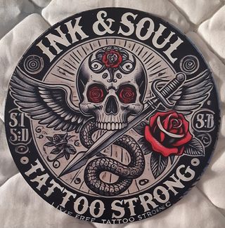 Poster Redondo de Metal con un Diseño llamativo de Calavera, Rosas y Serpiente. - Diseño Ink & Soul Tattoo Strong. - Motivo central de calavera con rosas y espada. - Borde decorativo con detalles. - Tamaño aproximado de 20x20 cm.
